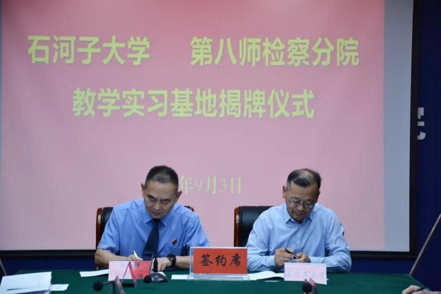 为深入贯彻落实最高人民检察院和教育部联合印发的《关于加强新时代检察机关与高等学校合作的意见》,进一步促进校检理论实务合作,推动司法实践与法学教育深度融合,9月3日,石河子大学第八师检察分院教学实习基地揭牌仪式在第八师检察分院隆重举行。石河子大学党委委员、纪委书记牛新民,法学院副院长张瑜及相关科室主任,第八师人民检察院分院党组书记、检察长晁东,党组成员、副检察长蒋学雷及各部室负责人出席仪式。