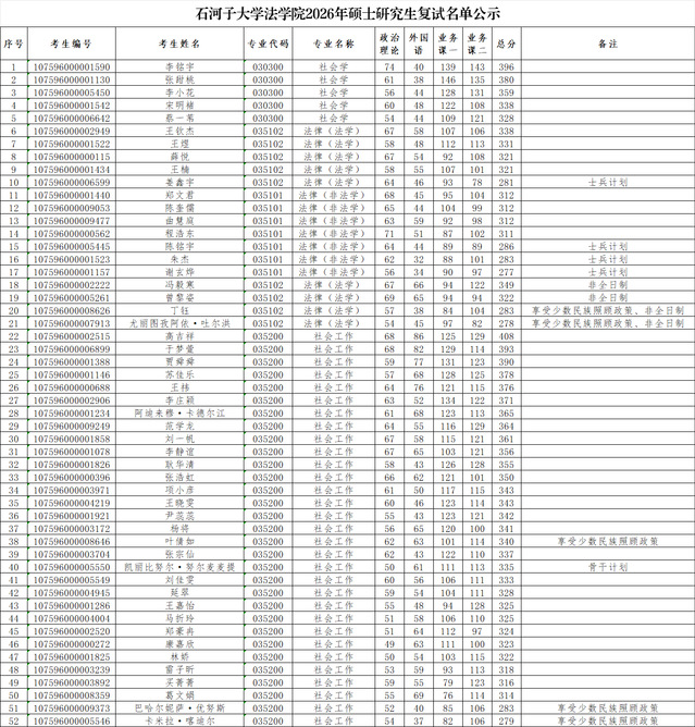 石河子大学法学院2026年硕士研究生招生复试名单公示